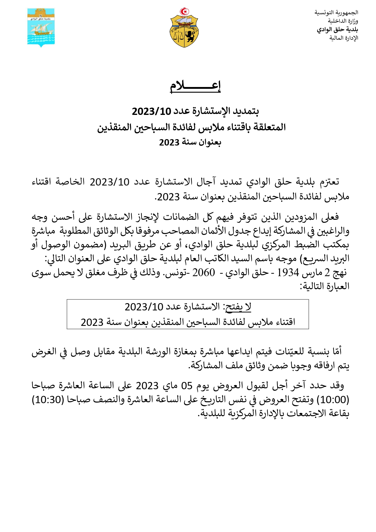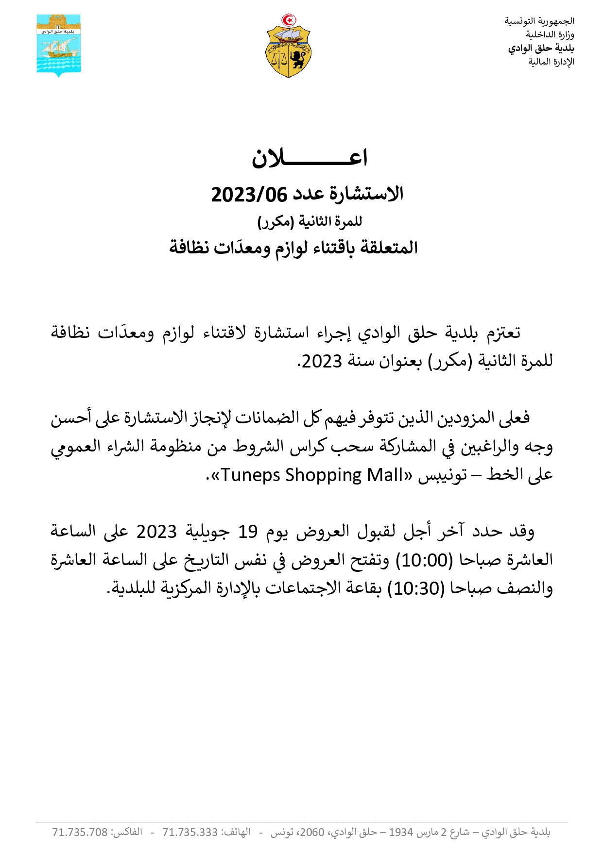 إعلان استشارة عدد 2023/06 للمرة الثانية مكرر المتعلقة باقتناء لوازم ومعدات نظافة