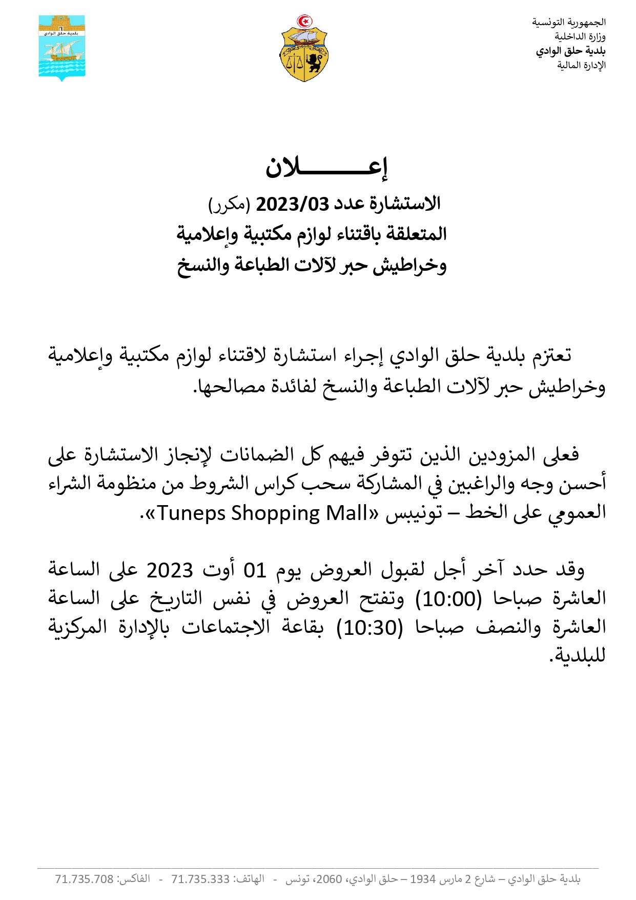 إعلان استشارة عدد 2023/03 (مكرر) المتعلقة باقتناء لوازم مكتبية وإعلامية