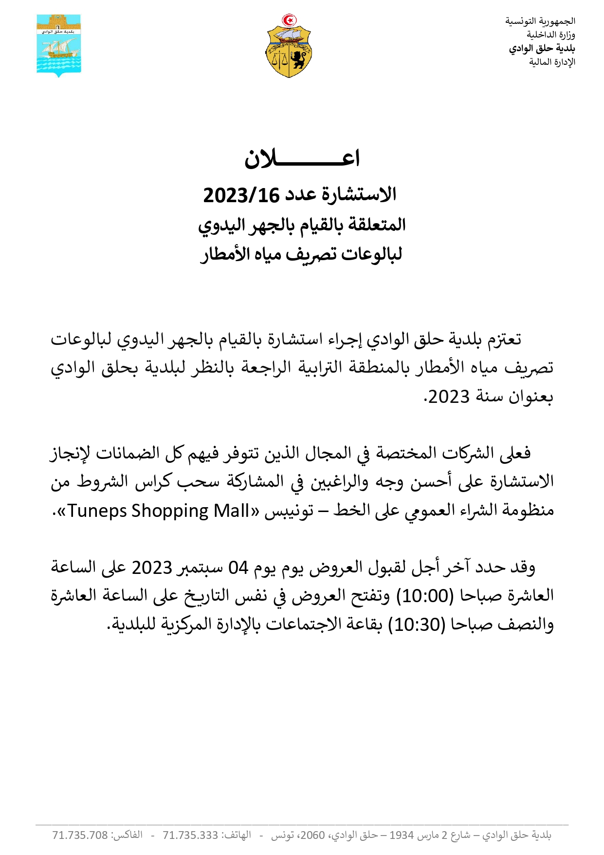 إعلان استشارة عدد 2023/16 المتعلقة بالقيام بالجهر اليدوي لبالوعات تصريف مياه الأمطار