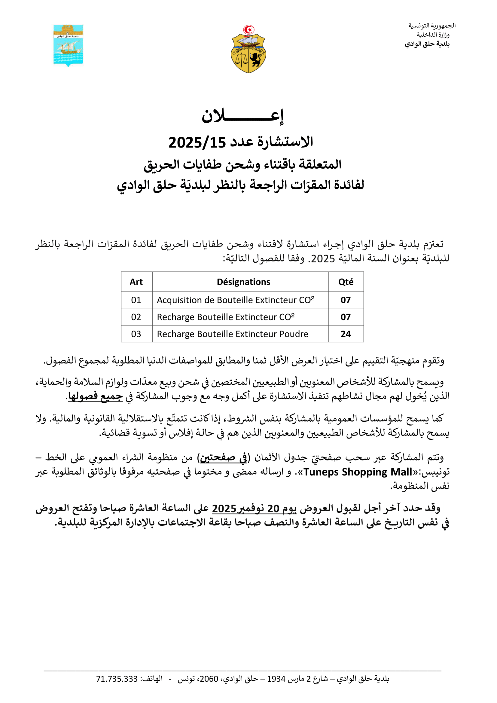 الاستشارة عدد 2025/15 المتعلقة باقتناء و شحن طفايات الحريق الراجعة بالنظر لبلدية لفائدة المقر حلق الوادي َ